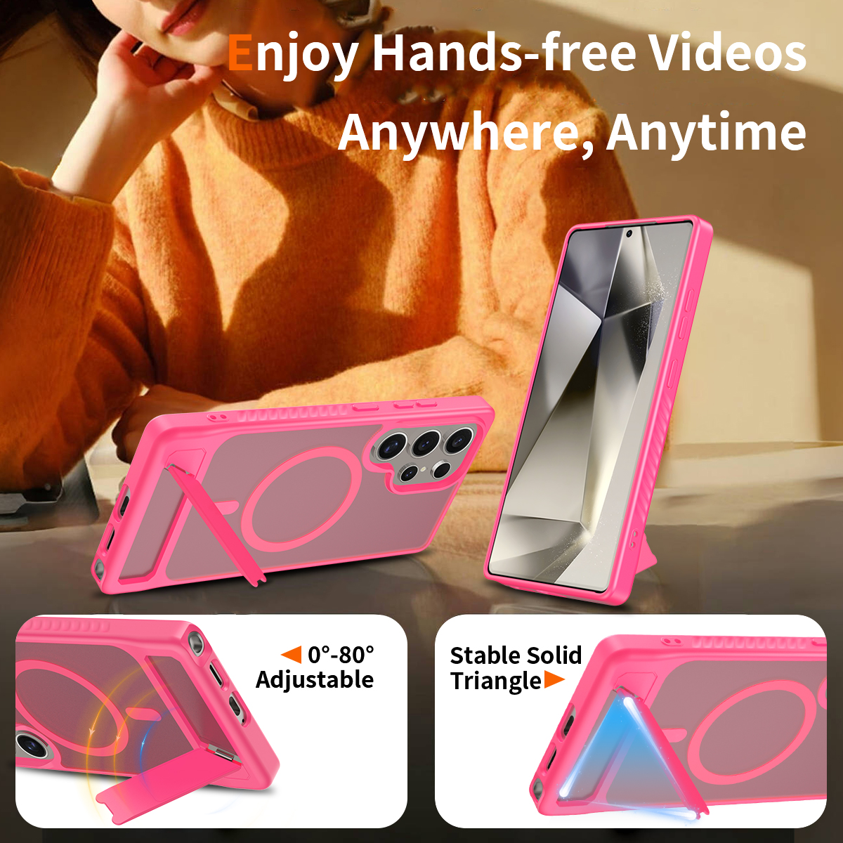 Love your Samsung S25 Ultra’s giant screen but hate propping it up awkwardly for videos? Tired of flimsy kickstands or bulky cases?Meet the 45° Magnetic Stand Case – a sleek, military-grade shield with a hidden pull-out stand that works in both portrait and landscape mode, plus MagSafe compatibility!“ ① 45° Adjustable Stand – Hands-Free Freedom